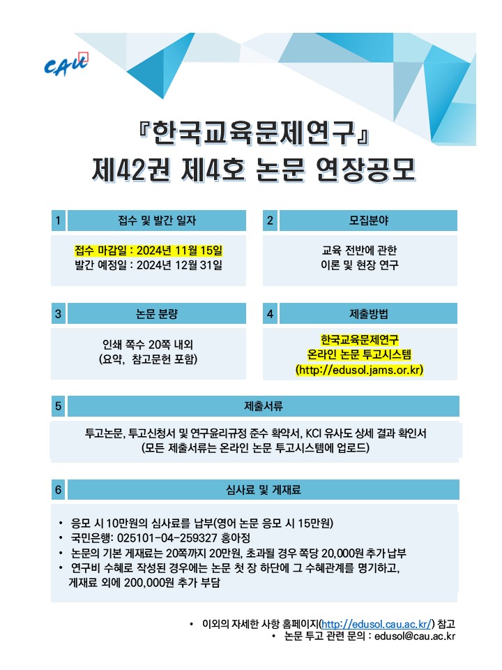 2024년 『한국교육문제연구』 제42권 제4호 게재 논문 공모 연장 안내(~11/15)