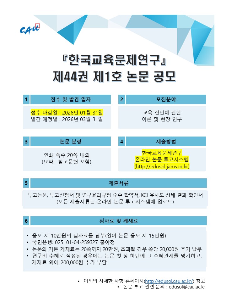 중앙대학교 한국교육문제연구소에서 연4회 발간하는『한국교육문제연구』논문집은 KCI 등재지 입니다.